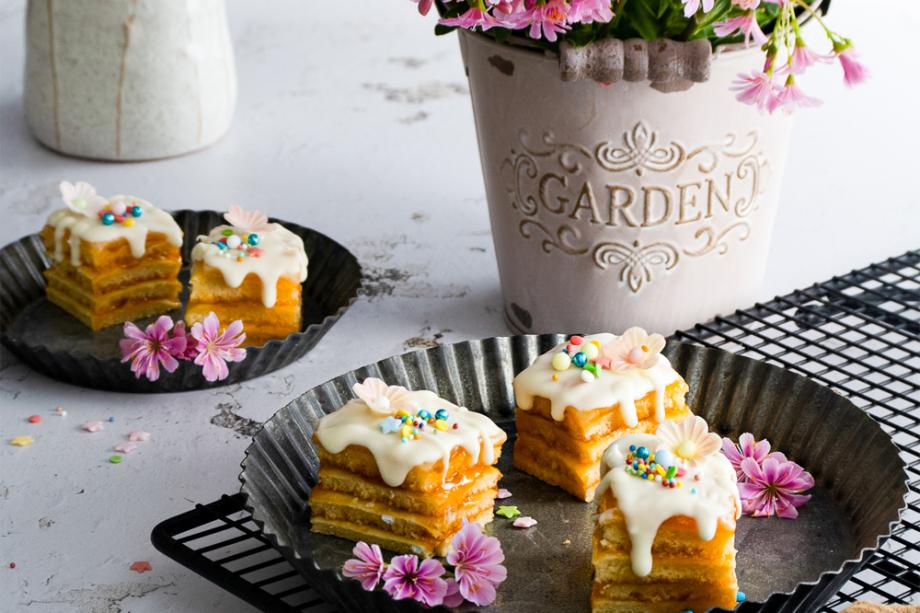 - Danach rausnehmen, in möglichst quadratische Teile schneiden. Mit Zuckerguss überziehen und mit Streuseln und essbaren Blumen verzieren, sofort servieren.