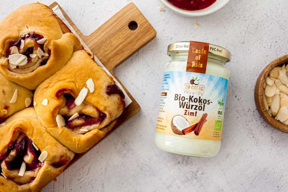- Für die Schnecken den fertig aufgegangenen Hefeteig zu einem Rechteck ausrollen (ca. 30 x 42 cm) und das Bio Kokos-Würzöl darauf verstreichen. Die Zwetschgen Füllung gleichmäßig darauf verteilen und vorsichtig von der längeren Seite zu einer Rolle aufrollen, in Scheiben schneiden und die Schnecken in die Auflaufform legen. Mit einem feuchten Tuch zudecken und nochmal 30 Minuten