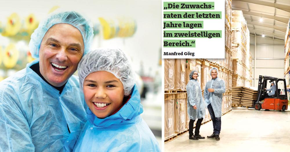 Manfred Görg mit Sohn Bruce, der gerne mithilft und mit Produktmanagerin Josephine Kirschgens im Lager © Frank Sträter (bio verlag)