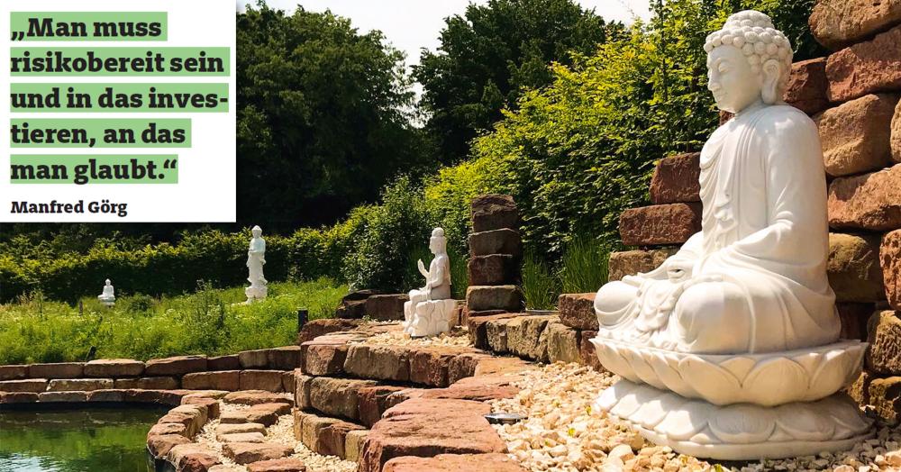 Buddah-Statuen säumen den Schwimmteich für die Mitarbeiter © Frank Sträter (bio verlag)
