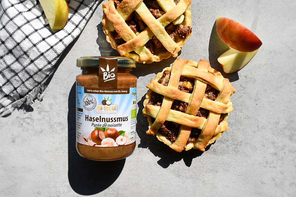 - In einer Schüssel die geschälten, entkernten und klein gehackten Äpfel mit den geriebenen Nüssen und Haselnussmus vermengen.