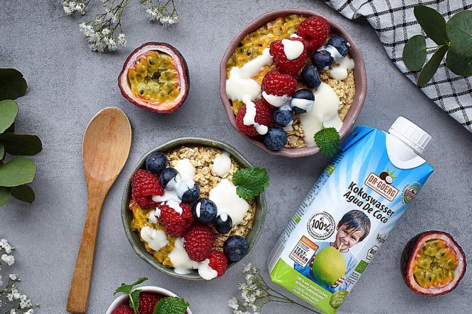 Alles miteinander vermengen, in eine Ofenfeste Form füllen und ca. 20 Minuten bei 180°C Umluft backen. Mit Toppings garnieren.