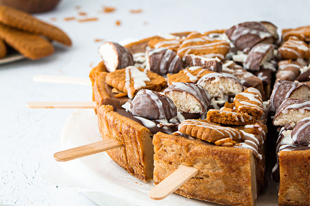 - Für die Lotus-Stücke die dunkle und weiße Schokolade schmelzen, miteinander vermischen, Käsekuchen hineintunken oder übergießen. Kokosmus im Wasserbad erwärmen und auf die Schokolade geben. Kokoschips darüber streuen und darauf die Kekse drapieren.