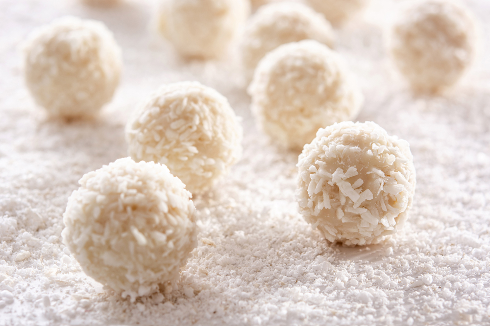 - Die Kugeln erst in der Glasur wenden und im Anschluss direkt in den Kokosraspeln rollen.