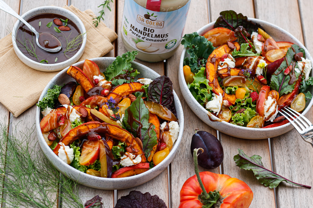 Alle Komponenten samt dem gerösteten Kürbis auf die Teller verteilen.