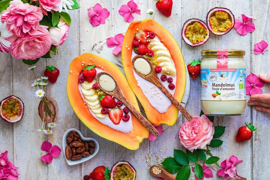 3. Fülle sie mit der Joghurtmischung und belege sie mit den Früchten und dem Nussmus.