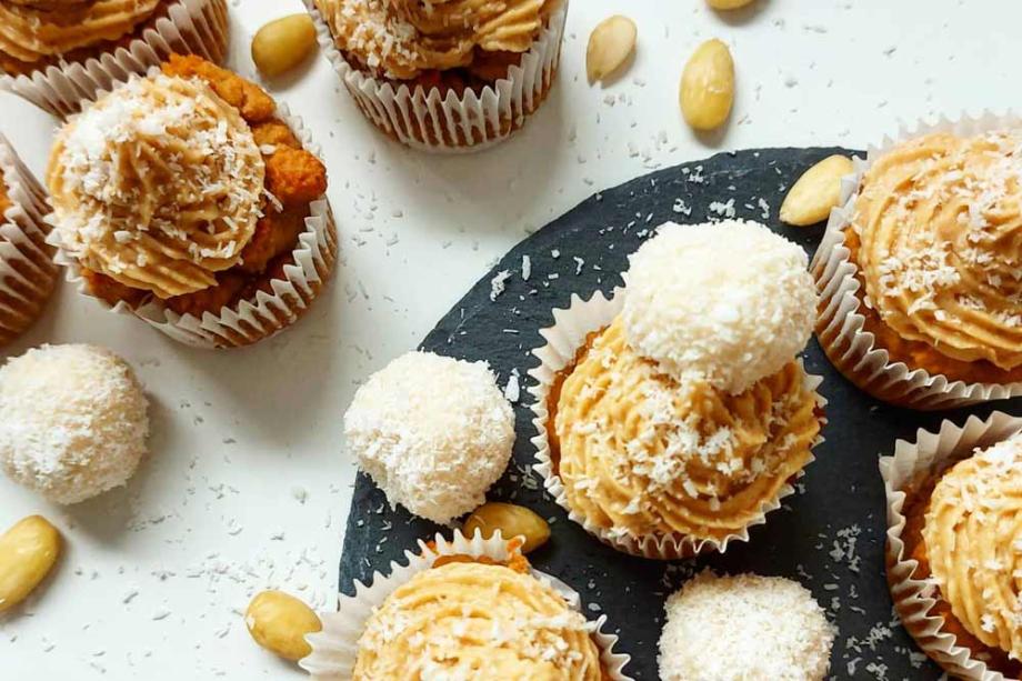 - Drücke jeweils eine blanchierte Mandel in die Mitte der Kugel. Wälze sie zum Schluss in Kokosraspeln. Kühl lagern oder sofort verzehren und die Cupcakes damit garnieren.
