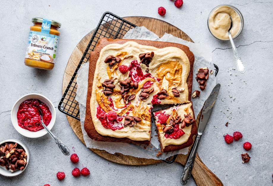 - Den Kuchen mit der Himbeermasse, den Erdnuss-Cluster und dem Erdnuss Crunch salted toppen.