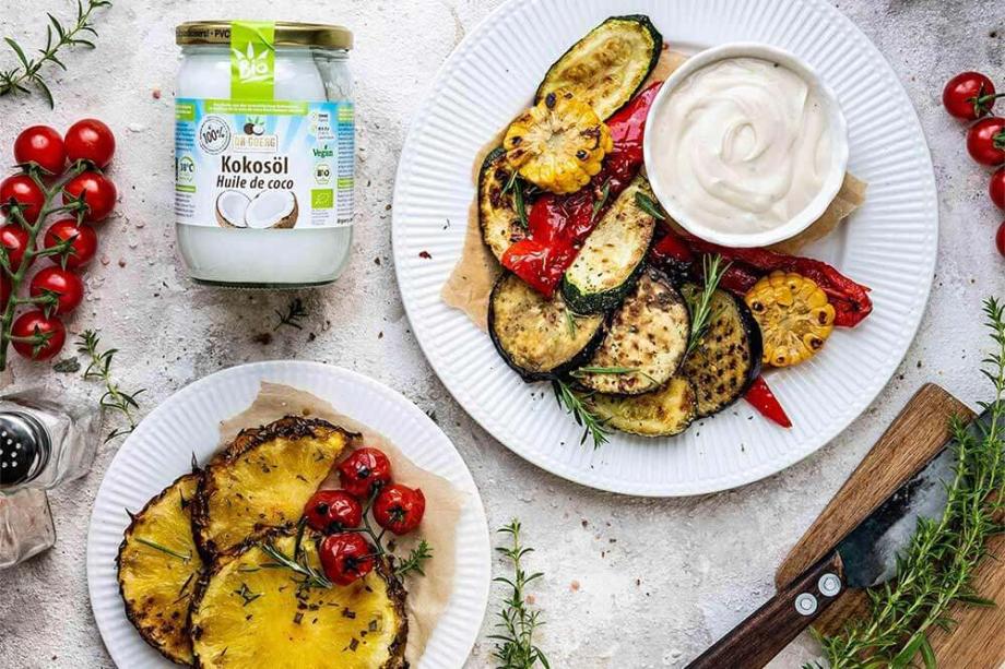 - Das gegrillte Sommergemüse mit dem Kokos-Limettendipp servieren und genießen.