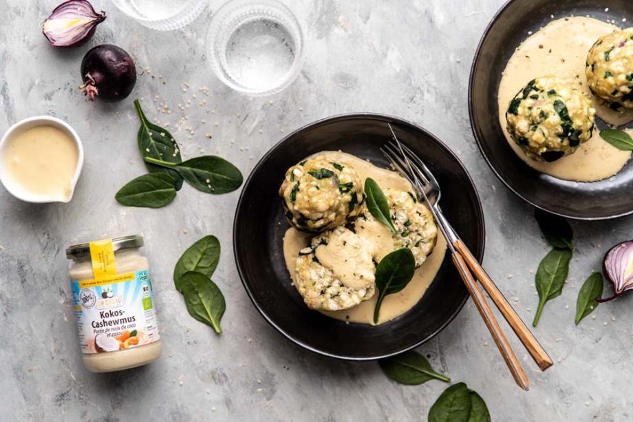 - Die gekochten Spinatknödel mit der Kartoffel-Cashew-Käsesauce servieren.