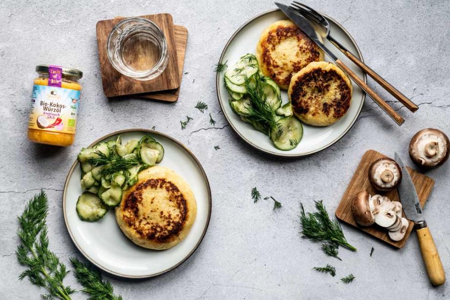 Vegane Potatocakes mit einer Gemüse-Pilzfüllung. Dazu servieren wir einen frischen Gurkensalat mit exotischem Dressing.