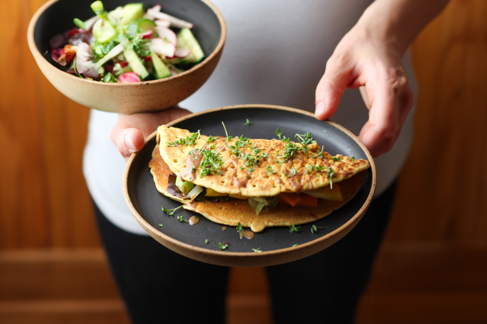 Entdecken Sie die pflanzliche Vielfalt mit unserem köstlichen veganen Omelette mit Gemüsefüllung! Dieses Omelette überzeugt nicht nur durch seine fluffige Konsistenz, sondern auch durch eine bunte Mischung aus frischem Gemüse.
