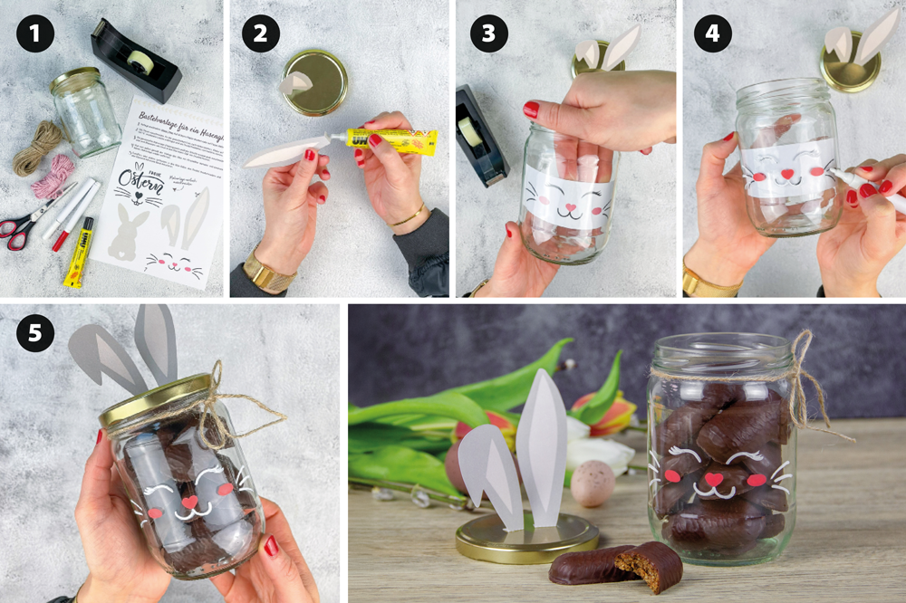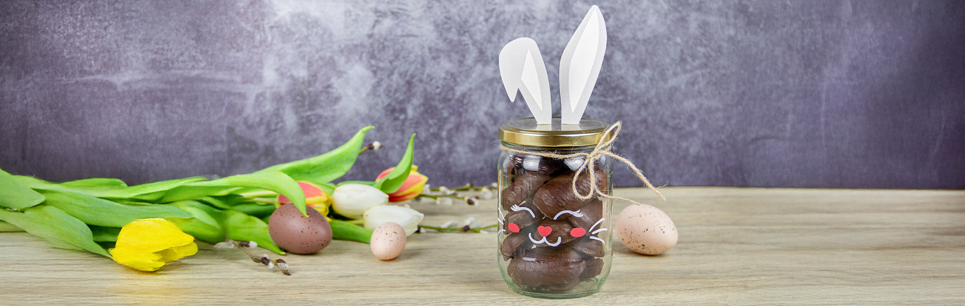 - Glas mit ein paar Osterleckereien befüllen, den Deckel draufschrauben und den Glasrand mit einem Band dekorieren. Fertig ist dein DIY Osterglas!
