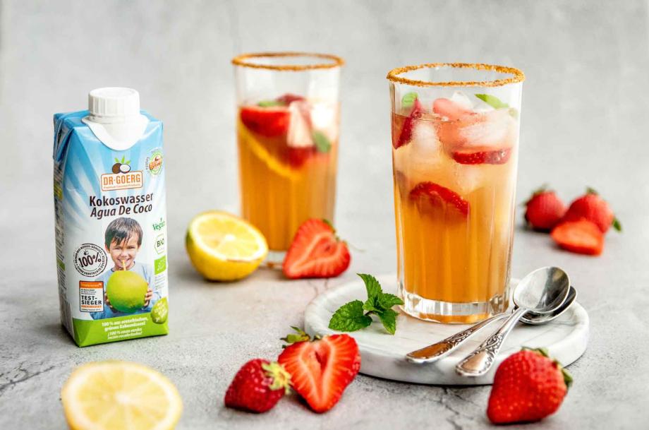 Für den Erdbeer-Gin: Ein Glas zur Hälfte mit Eiswürfeln füllen. Je Drink 1 cl Erdbeerlikör, 1cl Gin hinzugeben und 1 TL Kokosblütenzucker hinzugeben. Mit 2 Erdbeeren, einer Scheibe Zitrone und etwas frischer Minze verfeinern und das Glas mit Kokoswasser auffüllen.