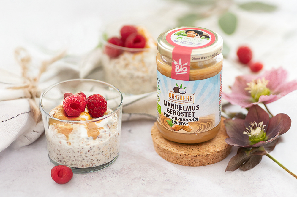 Overnight Kokos-Chia-Oats mit unserem gerösteten Bio-Mandelmus. Um diesen leckeren Gaumenschmaus am Morgen zu genießen, musst du am Vorabend nur 5 Minuten Zeit aufbringen.