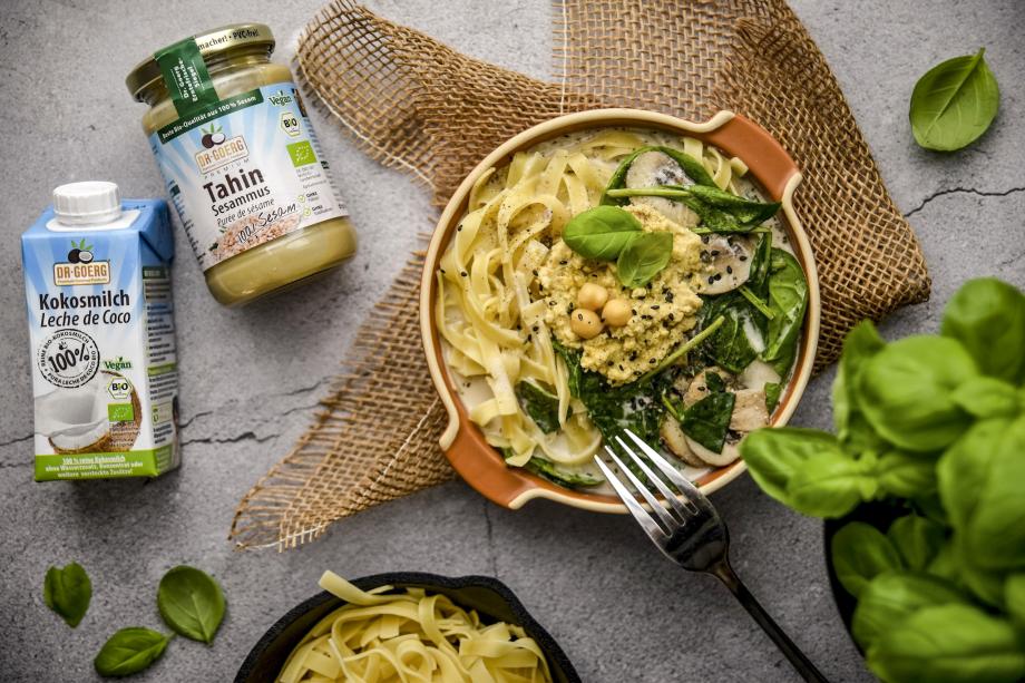 Vegan – einfach – würzig! Mit diesen drei Worten kann man unsere cremige Spinat-Pilz-Nudelpfanne mit Hummus am besten beschreiben.