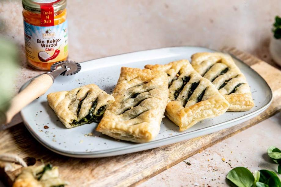 - Für eine schönere Backfarbe die Blätterteigtaschen vor dem Backen mit etwas flüssigen Kokosöl bepinseln. Anschließend gemäß der Backzeit auf der Verpackung gold-braun backen.