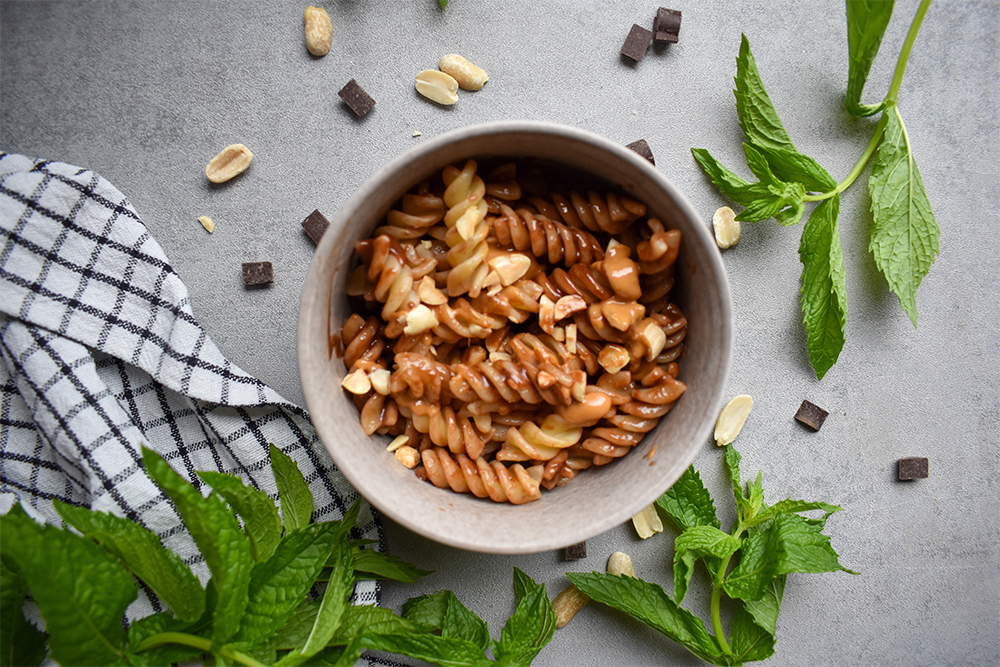 - Erdnussmus, Schokolade, Salz und Kokosblütenzucker zu den Nudeln geben und alles gut mischen.