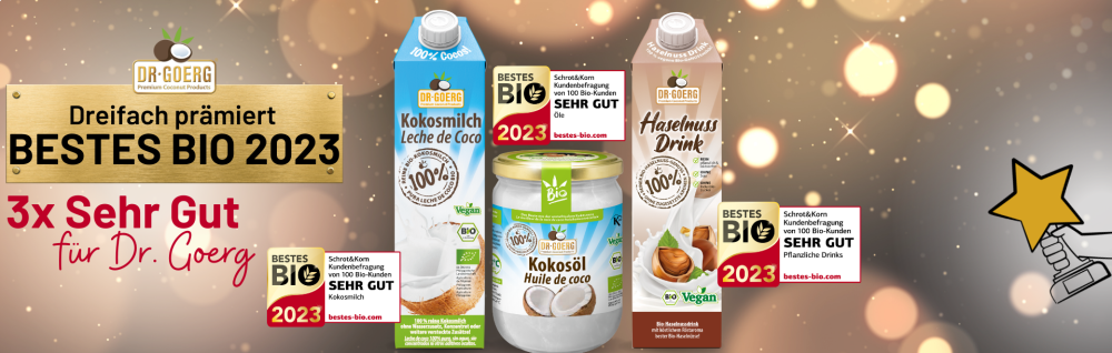 Bestes Bio 2023 – diesen Titel holte Dr. Goerg für seine Bio-Kokosmilch, das Bio-Kokosöl und den neuen Bio-Haselnussdrink. Seit Beginn nehmen wir als Spitzenreiter im Bio-Kokosnussbereich schon an der Kundenauszeichnung von Deutschlands auflagenstärkster Bio-Zeitschrift Schrot&Korn teil – und das mehr als erfolgreich. Fünfmal Bestes Bio gab’s davon allein in 2022 und auch in diesem Jahr lief es für uns alles andere als schlecht. Gleich drei unserer Produkte dürfen sich ab sofort mit dem Namen „Bestes Bio 2023“ schmücken.