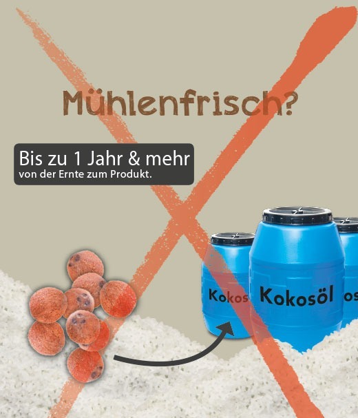 La qualité "fraîche du moulin" est un argument marketing qui ne fait que faire miroiter la fraîcheur au client. En réalité, de vieux copeaux de noix de coco ayant 1 an ou plus sont pressés en huile de coco. L'huile est certes "fraîche du moulin" mais en aucun cas fraîche.
