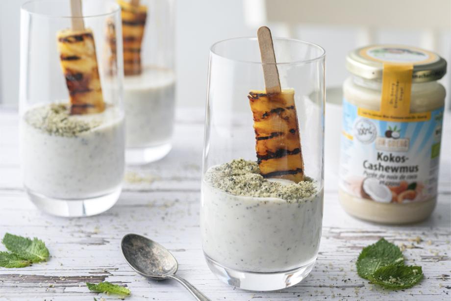 Dieses sommerliche Dessert für unsere Grill-Ananas mit Kokos-Cashew-Minzjoghurt hat es in sich! Die Kombination aus warmer Grill-Ananas gedippt in einer Mischung aus kühlem Kokos-Cashewjoghurt und einem Topping aus selbstgemachten Kokos-Minzraspeln macht nicht nur optisch etwas her, sondern schmeckt auch sommerlich-exotisch und wird deine Gäste begeistern!