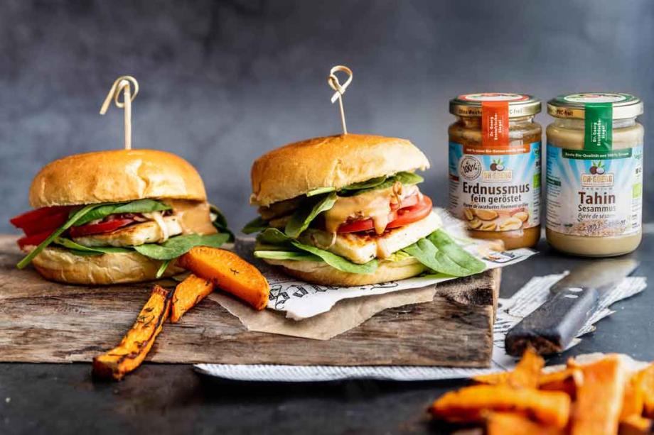 - Die Burger-Buns mit den Innenseiten kurz in einer Pfanne erwärmen. Anschließend je Burger mit einer Hand voll Babyspinat, 2-3 Tomatenscheiben, karamellisierten Zwiebeln, einem Halloumi-Patty und etwas Sauce beleben und gemeinsam mit den Süßkartoffelpommes servieren und genießen.