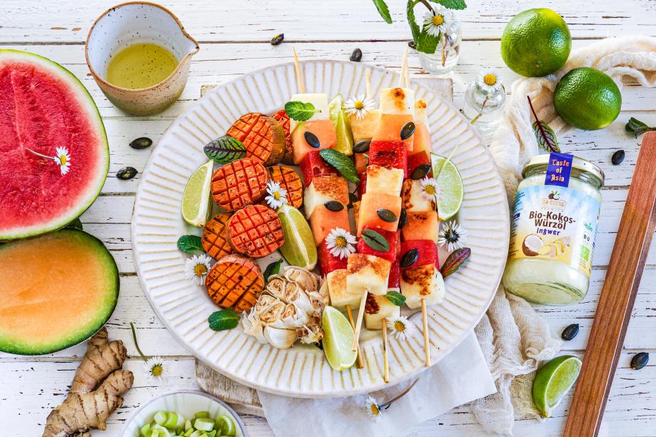 Wasser- und Honigmelone schälen. Halloumi und Melone in 2-3 cm große Würfel schneiden und nacheinander auf Grillspieße aufspießen.