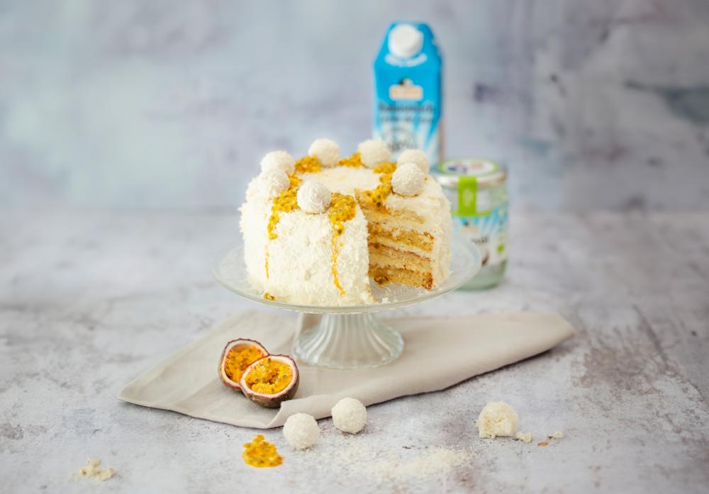 - Zum Servieren die Torte mit Koksraspeln bestreuen und mit den Kokos-Pralinen garnieren. Die Maracujas öffnen und das Mark dekorativ auf der Torte verteilen.
