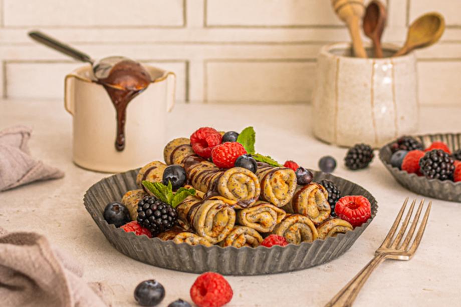 Mohn-Pfannkuchen mit Sirup und frischen Beeren servieren. Bon Appetit!