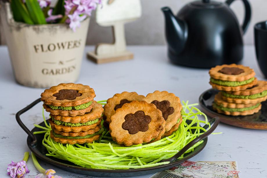 Das Glück kommt in Plätzchen! Heute backen wir süße Osterkekse mit einer Füllung aus weißer Schokolade und Matcha.