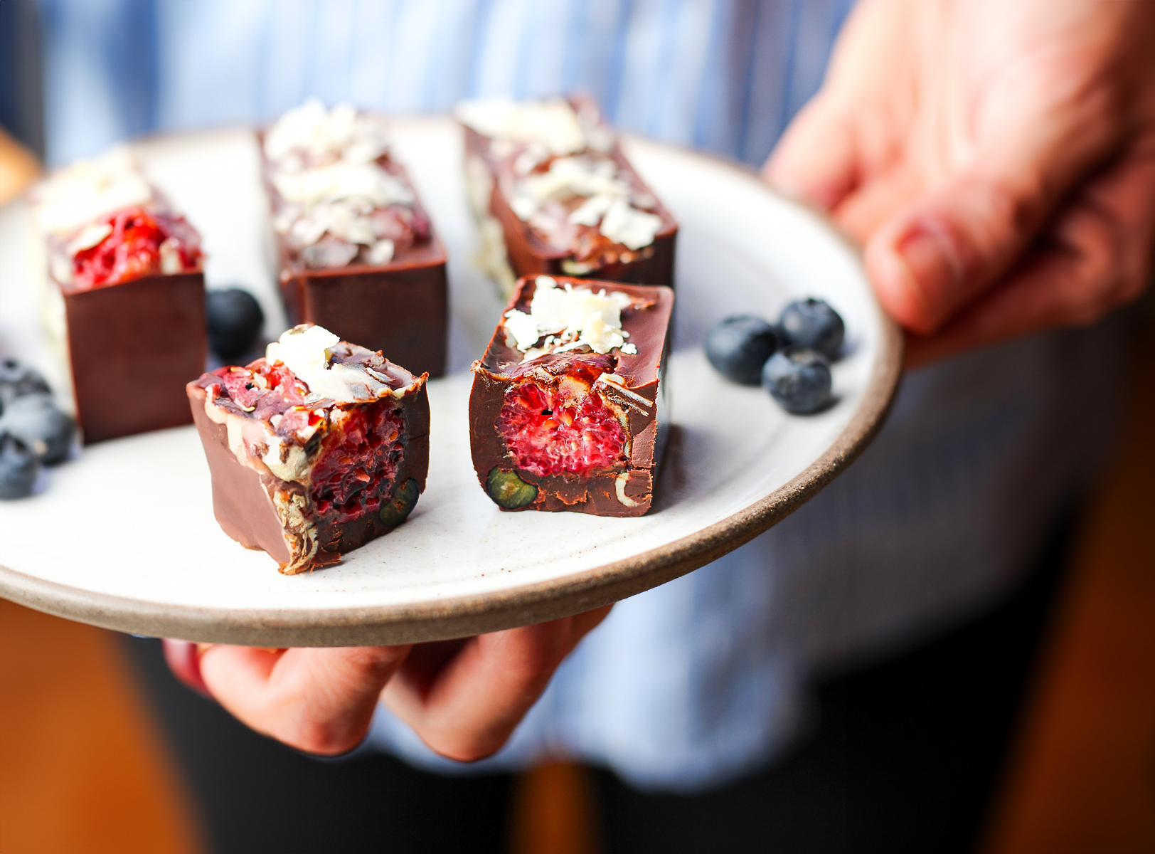 3. Die Heidelbeeren und Himbeeren (nach Wunsch halbiert) auf die Schokolade legen und das Mandelmus darüber geben.