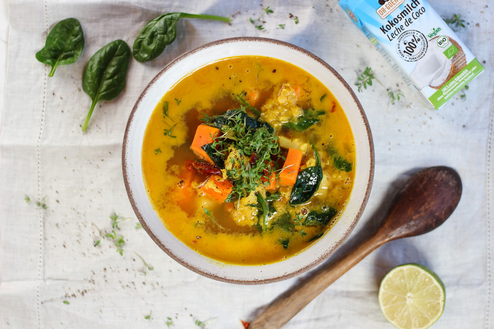 - Linsen, Kokosmilch und Gemüsebrühe dazugeben. Einmal aufkochen lassen. Dann die Hitze reduzieren und 15 Minuten köcheln lassen.
