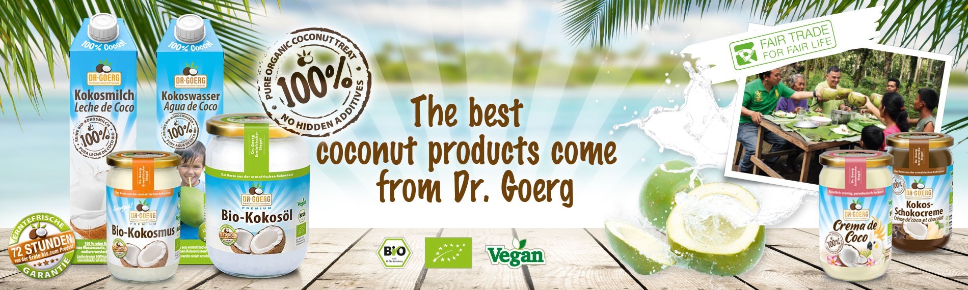 Ulteriori informazioni sulla vasta gamma di prodotti al cocco del Dr. Goerg! Olio di Cocco Extravergine Bio Premium, Latte di Cocco Bio Premium, Scaglie di Cocco Bio Premium, Farina di Cocco Bio Premium e Sciroppo dei Fiori di Cocco Bio Premium – il Dr. Goerg sazia i desideri di ogni cuore.