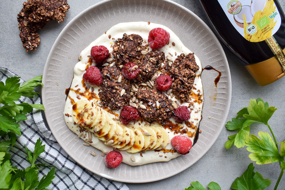 Mit Joghurt, Banane und frischen Beeren servieren und mit Kokosblütensirup toppen.