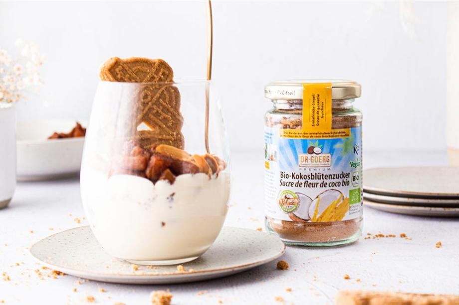 - Die Spekulatius Kekse klein bröseln und zur Seite stellen. Die Mandelblättchen, für die Dekoration, in der Pfanne anrösten, mit dem Kokosblütenzucker karamellisieren und abkühlen lassen.