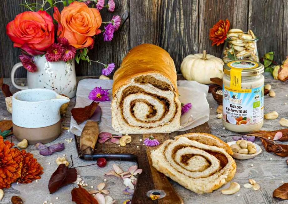 - Das Zimtbrot im Ofen bei 180 °C Ober-Unterhitze mindestens 25-30 Minuten golbraun backen. Vor dem Verzehr mit Cashewmus begießen.