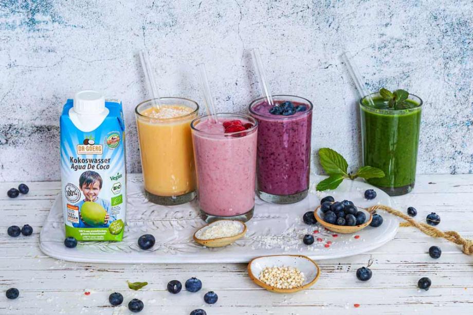 - Lila Smoothie: Alle Zutaten in einen Hochleistungsmixer geben und so lange pürieren, bis sie gut vermischt und völlig glatt sind. Wenn die Masse zu dickflüssig ist, etwas mehr Kokoswasser hinzufügen.