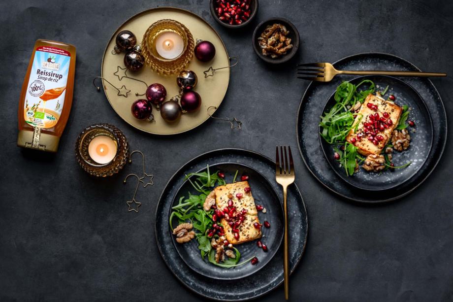 Vorspeise mit Explosions-Gefahr. Denn unser granierter Ofenfeta mit unserem Bio-Reissirup und einem Topping aus Granatäpfeln und Walnüssen ist einfach der Burner.