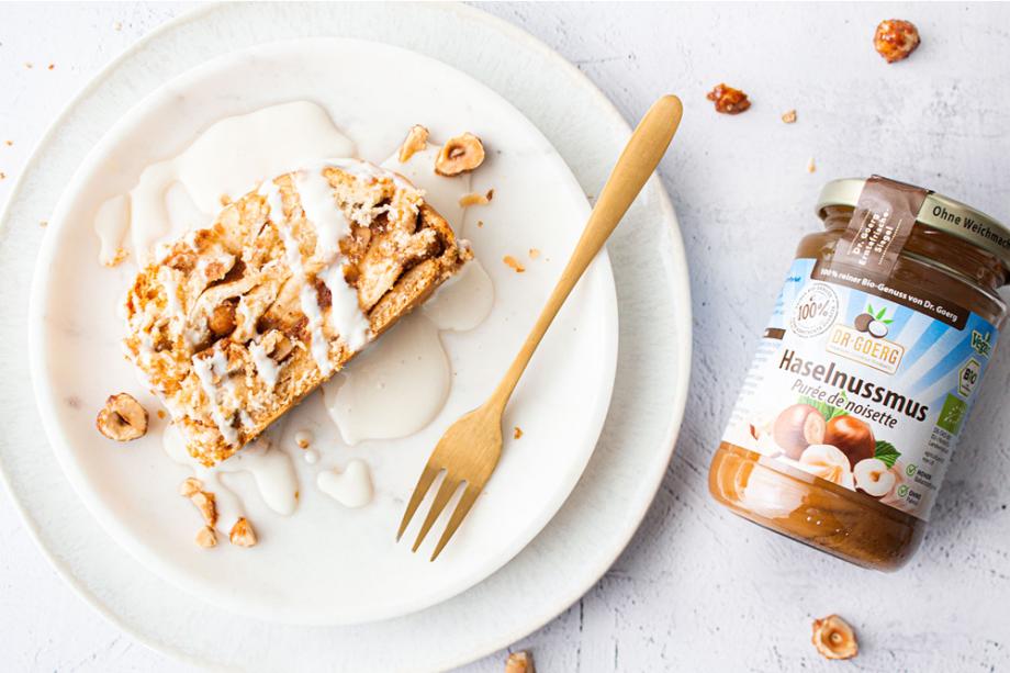 Das Haselnussmus mit dem Puderzucker vermischen und damit den Teig bestreichen. Haselnüsse darauf verteilen und von der langen Seite her aufrollen.