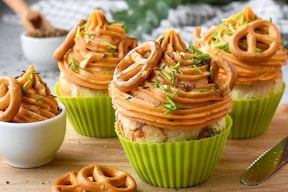 Laugen-Cupcakes! Die backen sich sogar fast schon von allein und sind in der Zubereitung einfacher, als Muffins mit einer Fertigbackmischung zu backen.