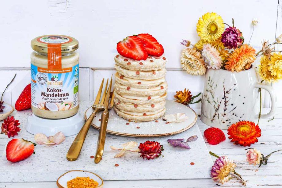 - Fertige Pancakes mit Kokos-Mandelmus bestreichen und mit saisonalem Obst genießen. Wer mag kann sich die Pancakes noch mit Kokosraspeln bestreuen.