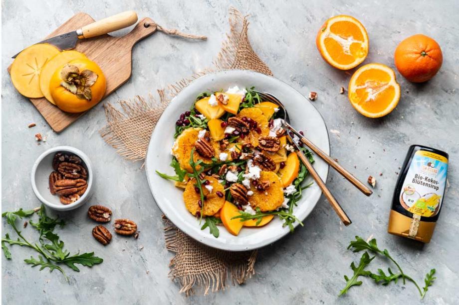 Salat ist mehr als Diätfood – bereitet unseren Orange Kaki Salat zu und lasst euch vom Gegenteil überzeugen!