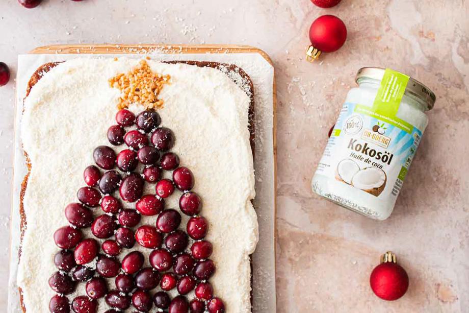 Die Creme mit Kokosraspeln bestreuen. Dann die Cranberrys in der Form eines Weihnachtsbaums auf den Kuchen geben. Dabei unten und oben Platz lassen.