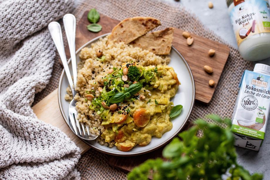 - Mit Wasser und Kokosmilch ablöschen und bei niederer Hitze köcheln lassen, bis das Gemüse weich gekocht ist und das Curry eine dickflüssige Konsistenz erreicht hat. Bei Bedarf einfach etwas mehr Wasser hinzugeben.