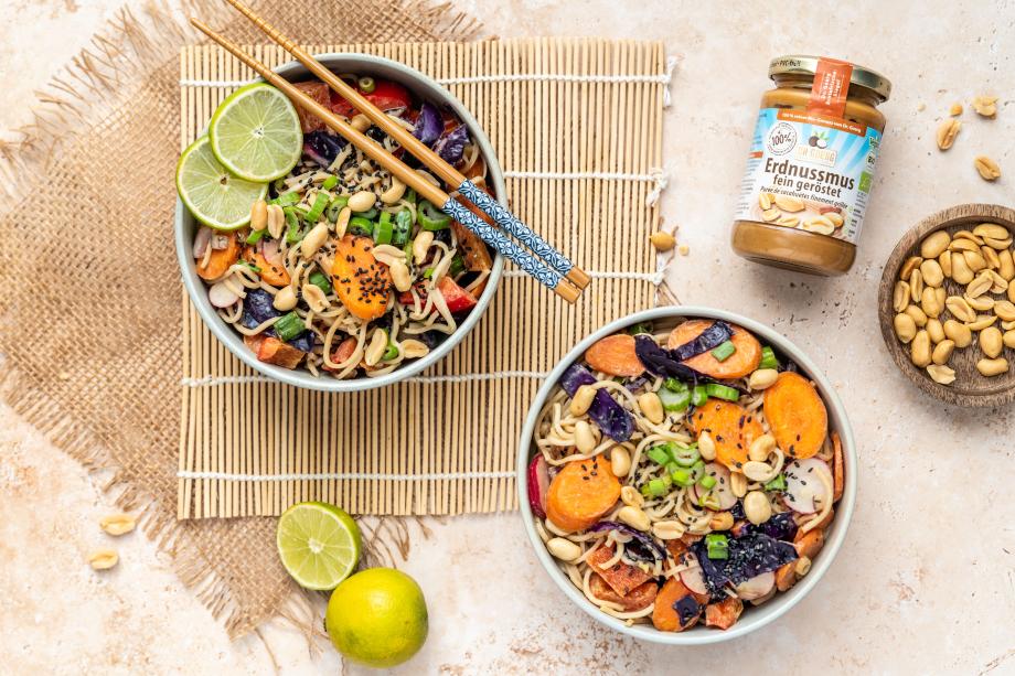Thai-Nudelsalat mit Erdnussdressing. Durch den frischen Geschmack eignet sich der Salat für lange Grill und Abenteuer-Nächte. Es ist alles dabei, was das Kokos-Herz verzaubert.