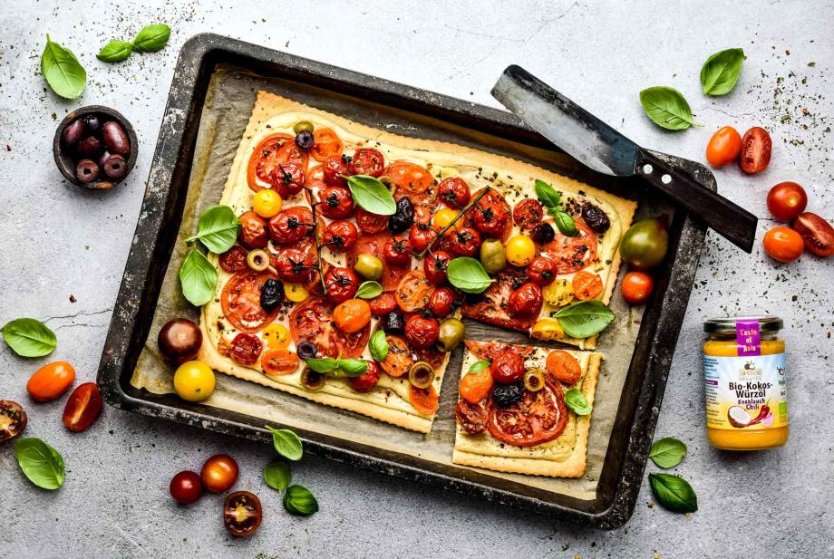 - Creme-Soße: Soja-Joghurt mit Cashewmus in einen Mixer geben und zu einer homogenen Creme verarbeiten. Mit Salz, Pfeffer und etwas Knoblauchpulver abschmecken. Anschließend gleichmäßig auf dem ausgerollten Tarte-Boden verteilen.