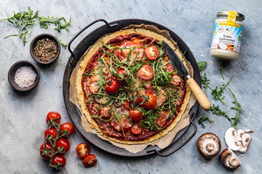 Zwischen 2 Backpapierscheiben zu einem Pizzateig ausrollen. Mit etwas Kokosöl bepinseln und für 5 Minuten im vorgeheizten Backofen vorbacken. Anschließend herausnehmen.