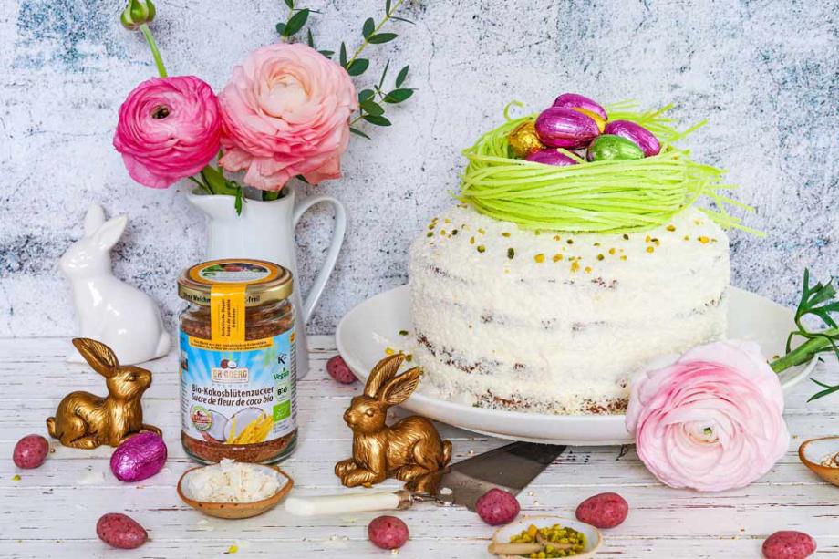 - Die Torten in der Mitte auseinanderschneiden, mit dem Fruchtaufstrich und der Glasur bestreichen. Die restliche Glasur rundum verteilen und den Carrot-Cake mit Kokosraspeln und Pistazienstücken bestreuen.