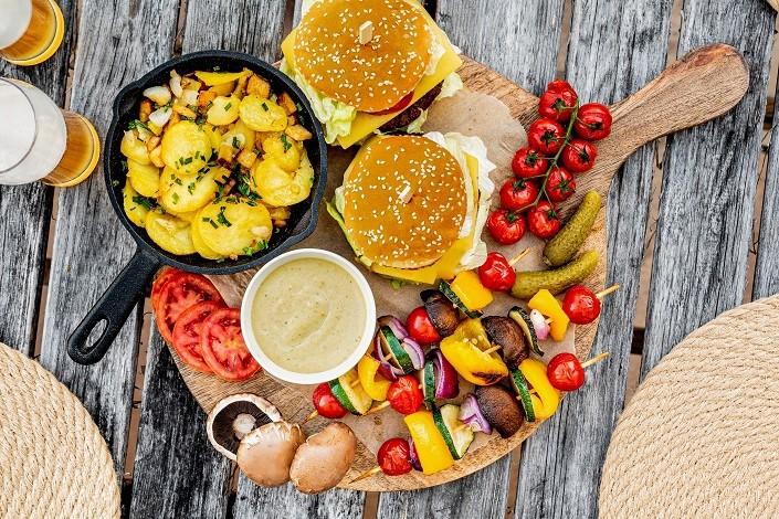 - Die Burger-Patties mit Würzöl bepinseln und auf dem Grill anbraten. Nach dem Wenden mit Scheibenkäse belegen und bei geschlossener Grillhaube grillen, bis der Käse geschmolzen ist.